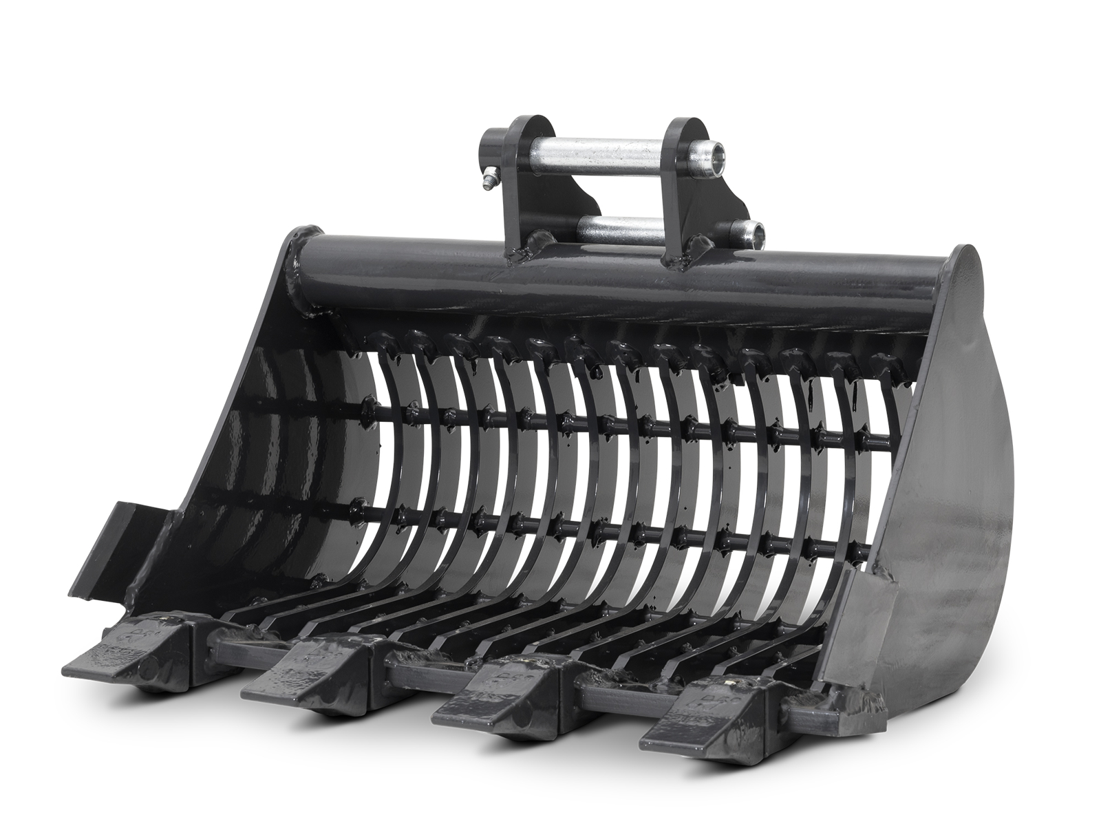Cazo rastrillo, cazo para piedra, para miniexcavadoras DELEKS® S100 y KUBOTA S100, K008-3, U10-3, K008-5, U10-5. Se utiliza principalmente para el dragado de cursos de agua, la selección de residuos de construcción durante los trabajos de demolición, preparar el suelo antes de la siembra o la preparación del paisaje, etc...