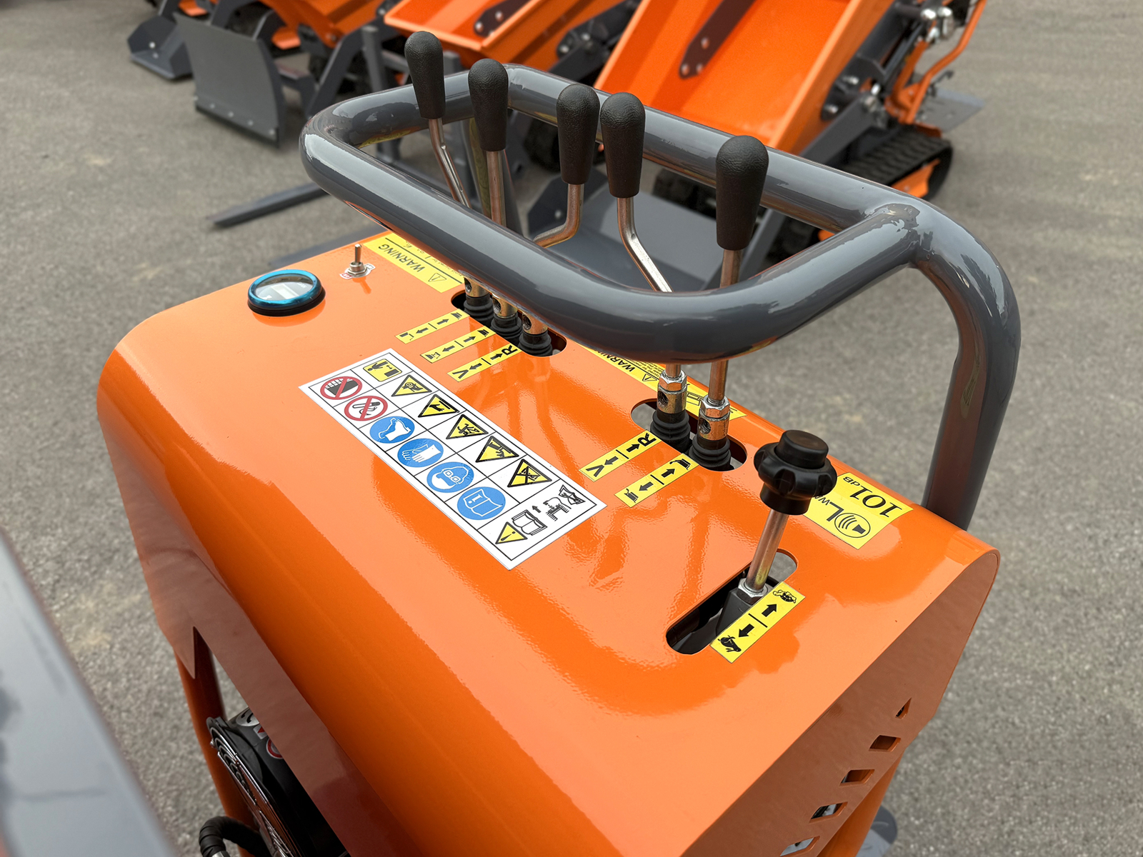 Compact high-performance tracked dumper designed for material handling with raised discharge for direct unloading into vans and trucks.