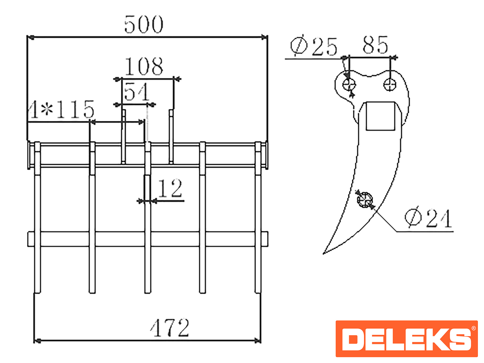 DELEKS® Rake, Multiripper bucket for miniexcavator.
