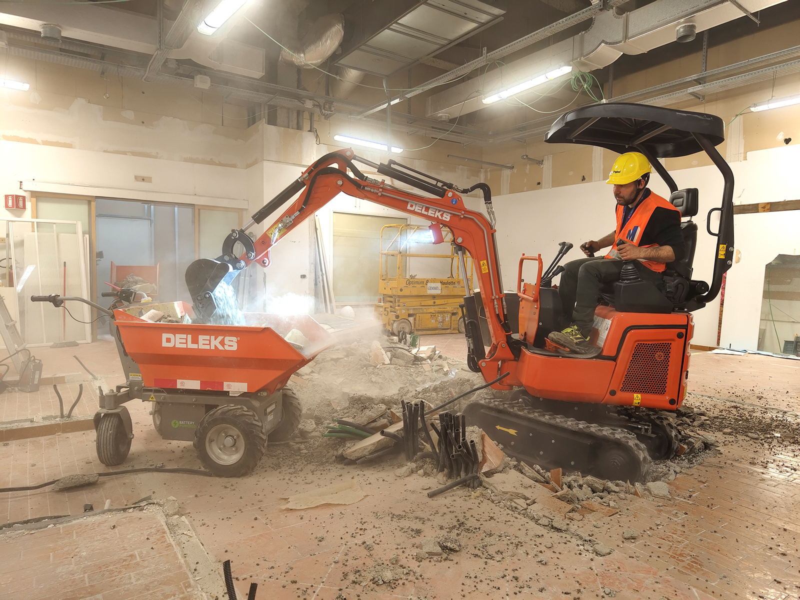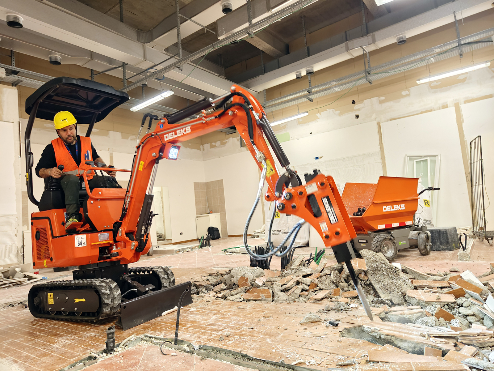 The DELEKS® E110, equipped with DELEKS 350L hydraulic breaker and standard bucket, and supported by DELEKS 100% electric wheelbarrows, enabled safe demolition and material handling, with zero emissions and reduced noise levels.