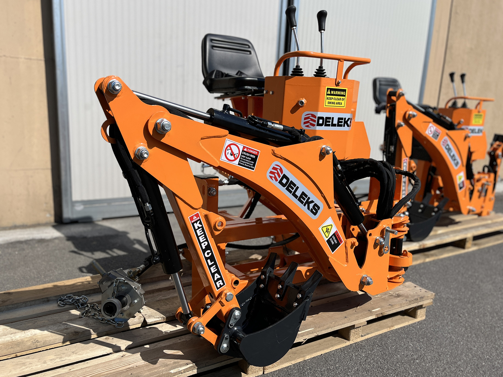 Mini backhoe for universal compact tractors - DELEKS® DRS-1000T - 358 kg - Side shift frame with manual locking - Oil system.