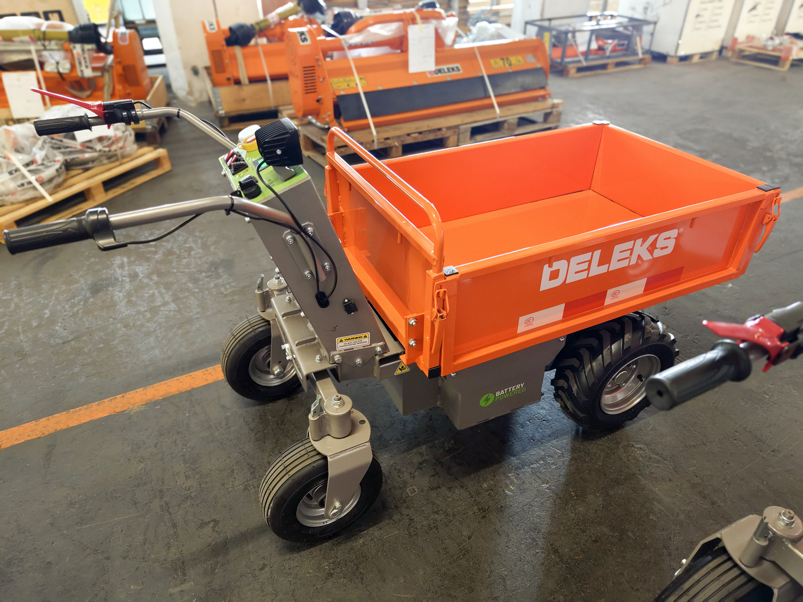 This DELEKS® wheelbarrow with electrified motor can carry a load of 500 kg, it does not make any noise, it is therefore ideal in landscaping, riding stables, greenhouses or stables, for transporting waste, shrubs, wood, tools, etc.