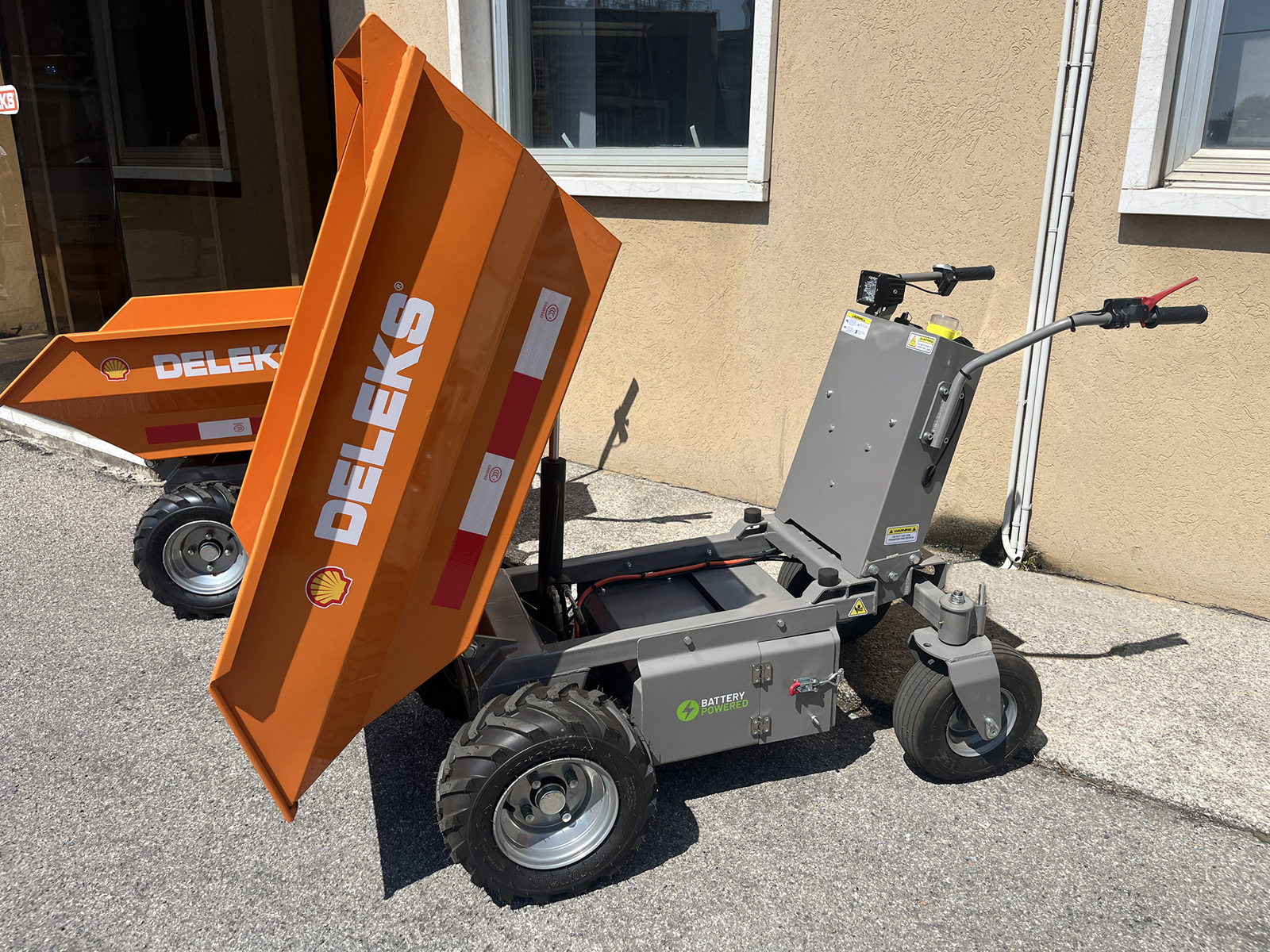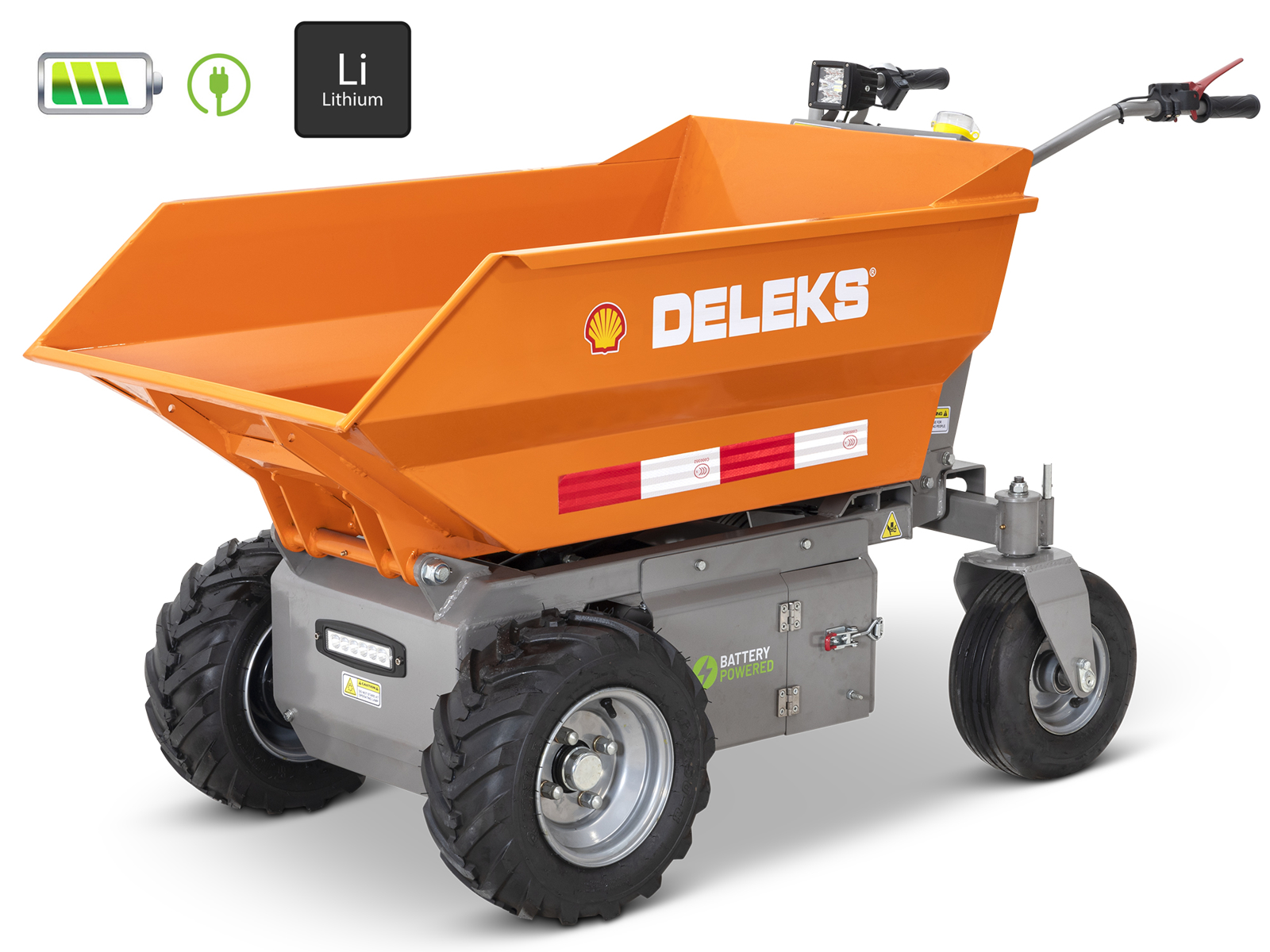 Carretilla minidumper eléctrica DELEKS® XE-500He Lithium con motor eléctrico, Batería de litio 48V 60Ah extraíble, volcamiento hidráulico, cuchara basculante, carga 500kg.