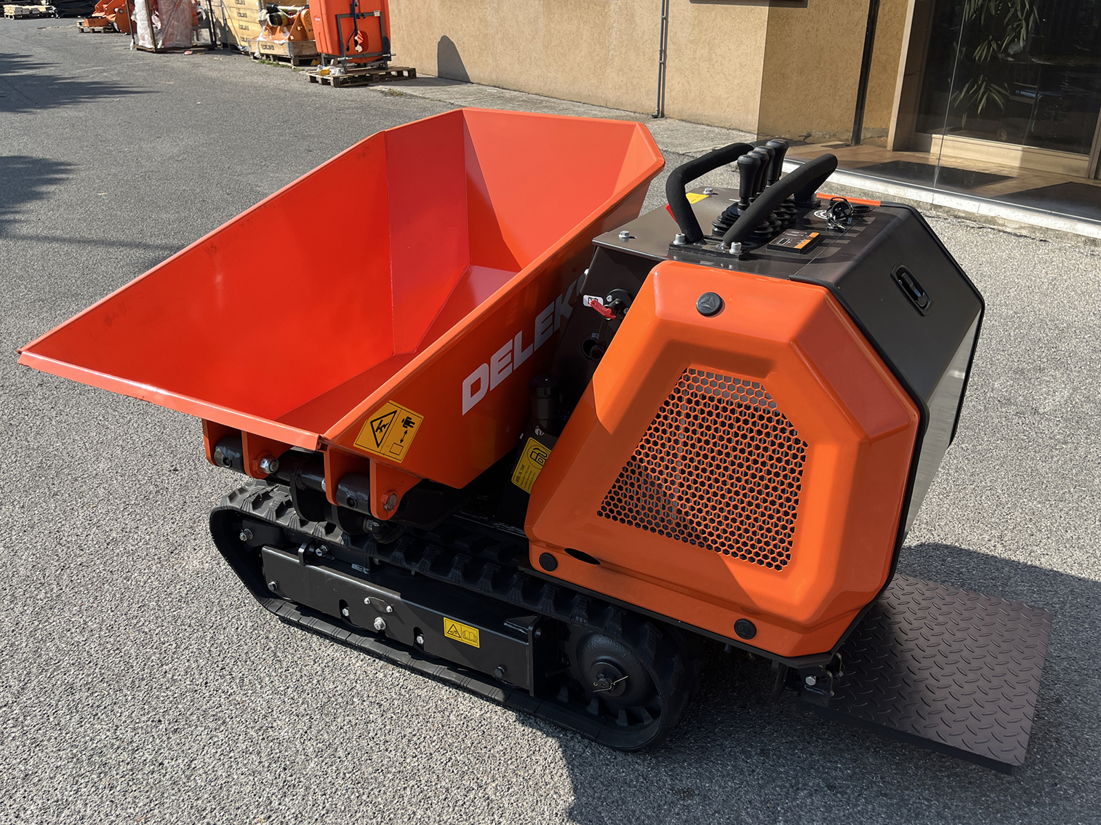 DELEKS® M8000R-KUBOTA Minidúmper de orugas autocargador, cazo con descarga trilateral en 180° con elevación y rotación hidráulicas, válvula de bloqueo sobre la rotación, transmisión hidrostática, plataforma del operador, motor Kubota, arranque eléctrico.