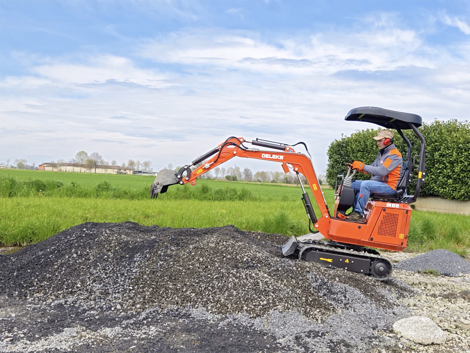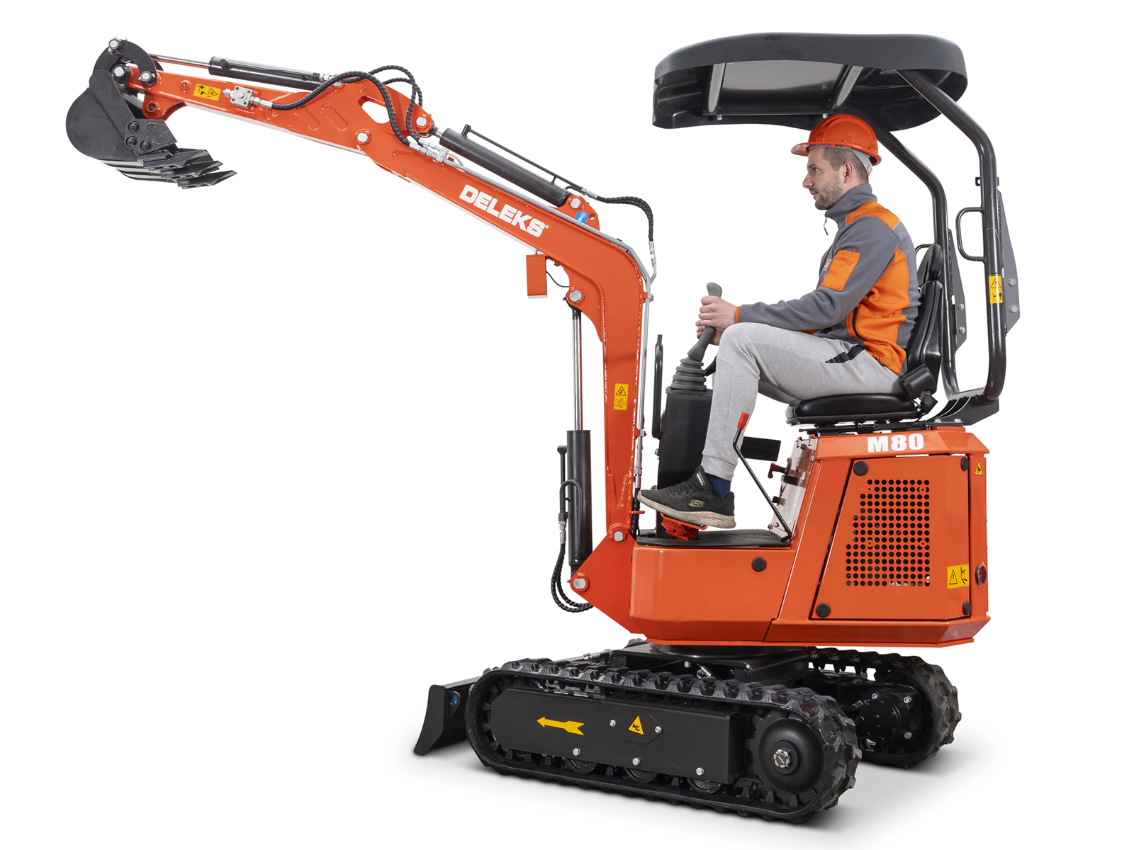 La miniexcavadora DELEKS® M80 de 850 kg, con motor de gasolina Briggs & Stratton XR2100 de 13,5 CV, es compacta, potente y fácil de usar.