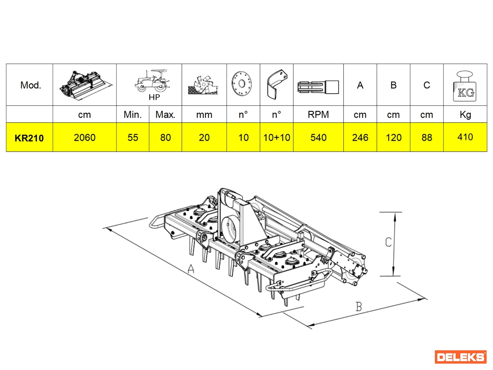 DELEKS® Grada rotativa de 206cm para tractores de 55 - 80 cv, con rodillo de barra trasero y cambio velocidad Tdf 540 R.p.m.