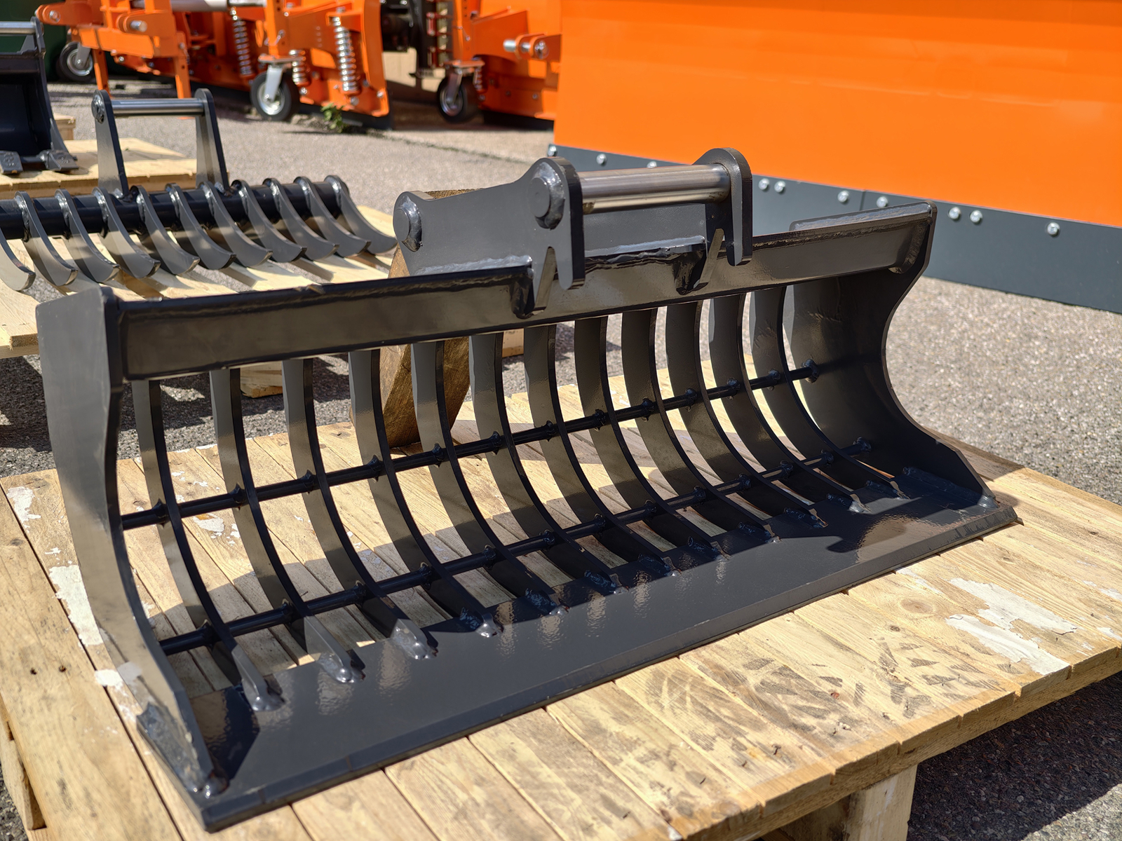 Cazo rastrillo, cazo para piedra, para miniexcavadoras DELEKS® S100 y KUBOTA S100, K008-3, U10-3, K008-5, U10-5. Se utiliza principalmente para el dragado de cursos de agua, la selección de residuos de construcción durante los trabajos de demolición, preparar el suelo antes de la siembra o la preparación del paisaje, etc...