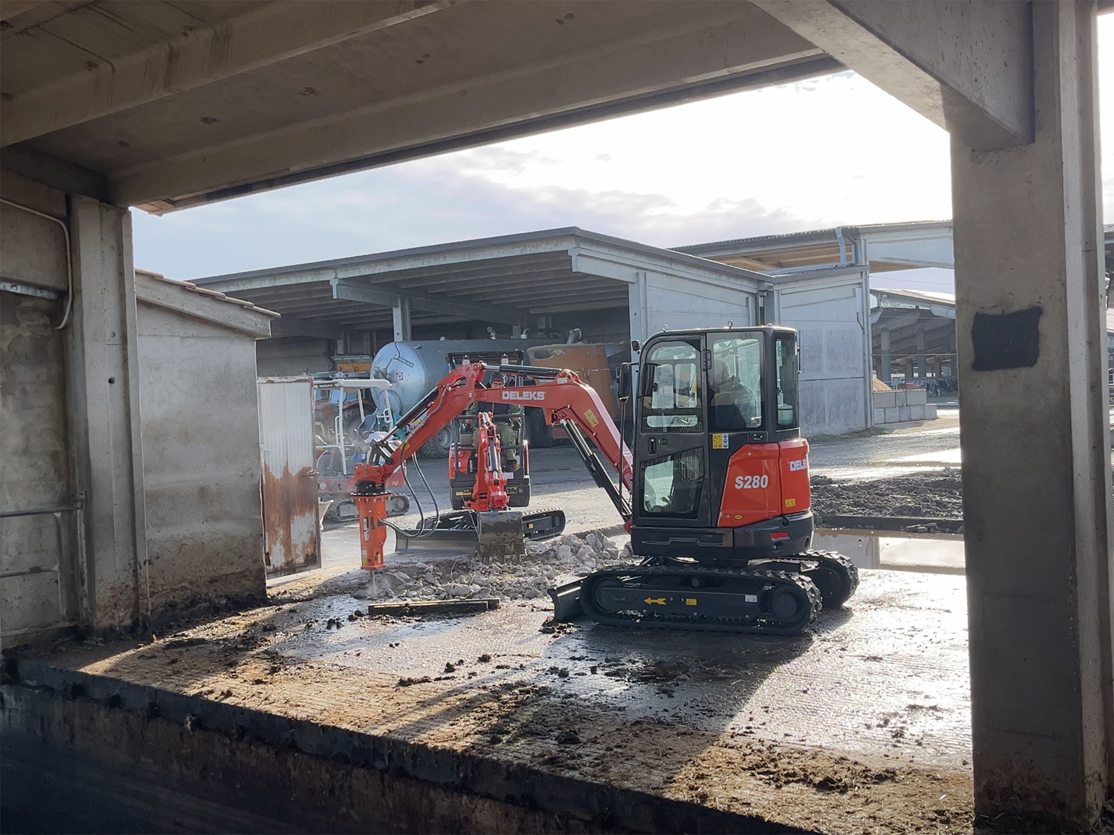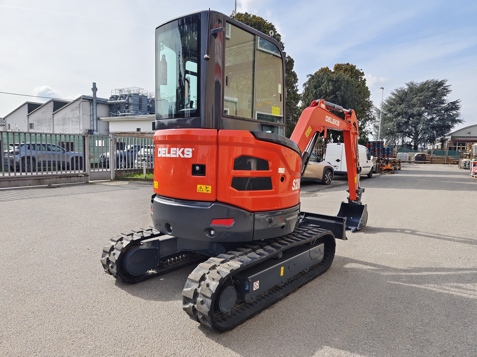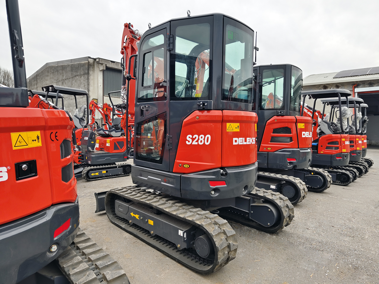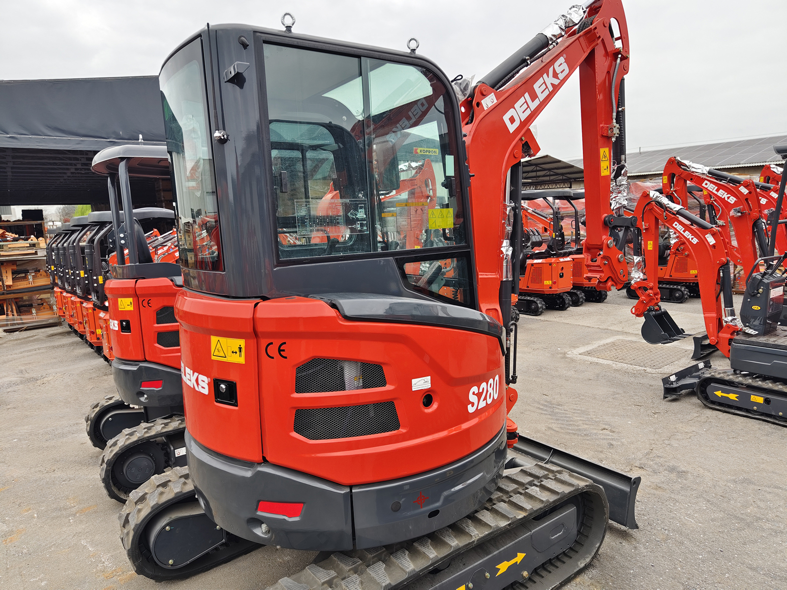 CERRARMiniexcavadora cabinada DELEKS® S280CK 2.8 t, equipada con motor Kubota D1105 Stage V de 3 cilindros (1123 cc), cabina calefactada, brazo orientable y doble velocidad de traslación hasta 4 km/h.