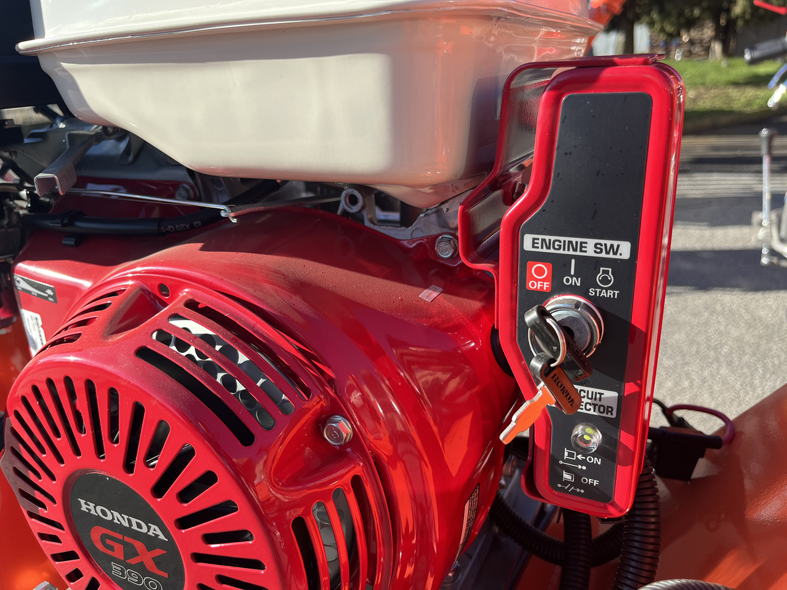 La máquina está equipada con un motor de gasolina Honda GX390, de 4 tiempos, 389 cc, 13,5 CV, con arranque eléctrico con llave y arranque manual de emergencia, reconocido a nivel mundial por su fiabilidad, durabilidad y rendimiento constante bajo carga.