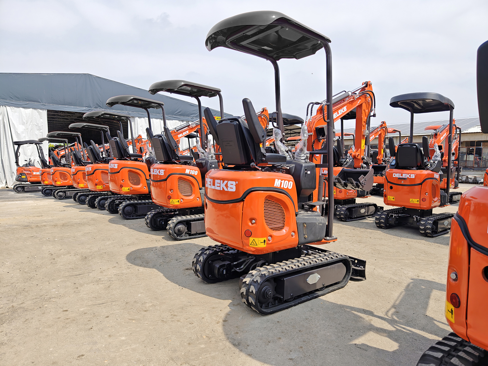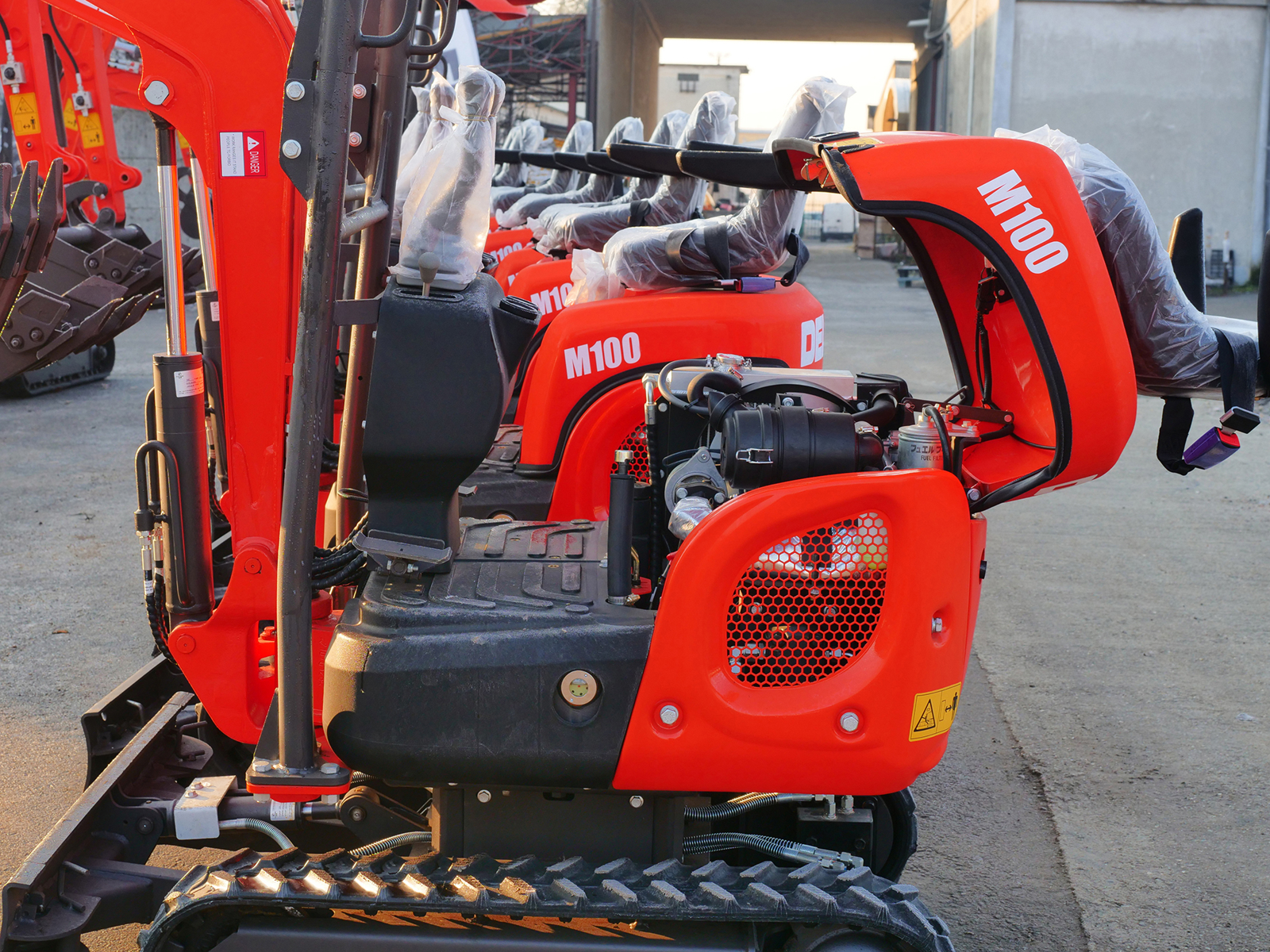 CERRARLa miniexcavadora compacta DELEKS® M100 (1 tonelada) está equipada con un motor diésel Kubota D722 de tres cilindros, chasis extensible y brazo orientable.