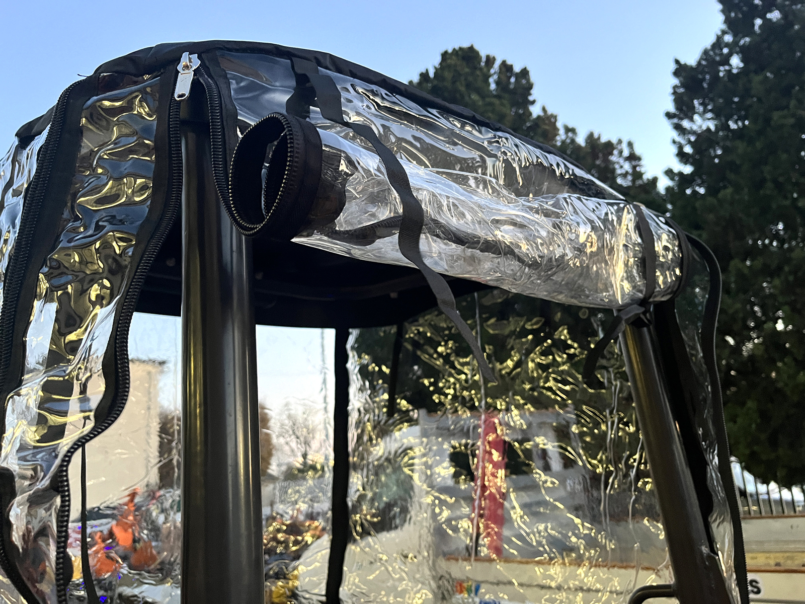 Este accesorio no está recomendado ni diseñado para protección contra el sol o uso prolongado bajo luz solar intensa. El material transparente, centrado principalmente en la impermeabilidad, puede aumentar el efecto invernadero dentro de la cabina (elevando significativamente la temperatura) y sufrir daños prematuros (decoloración o grietas) debido a la exposición constante a los rayos UV.